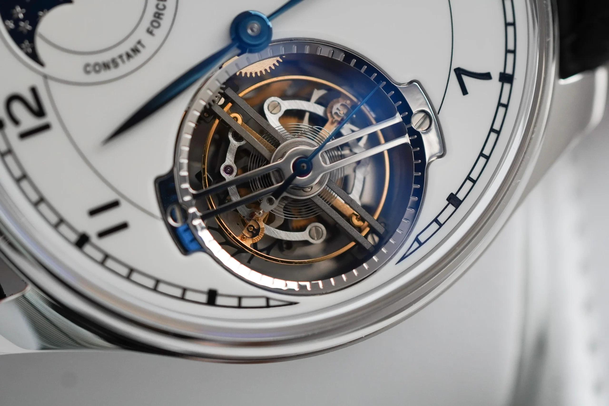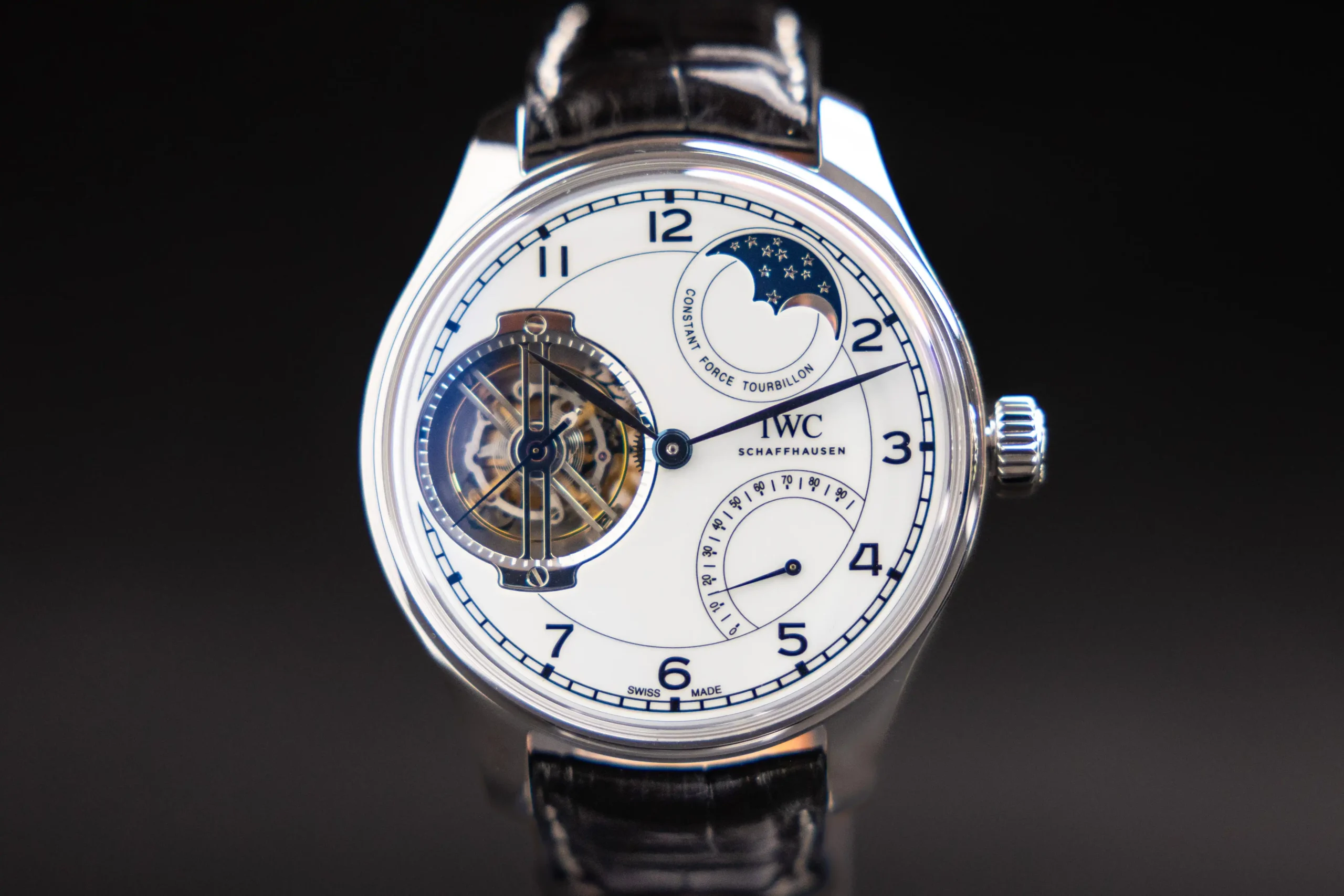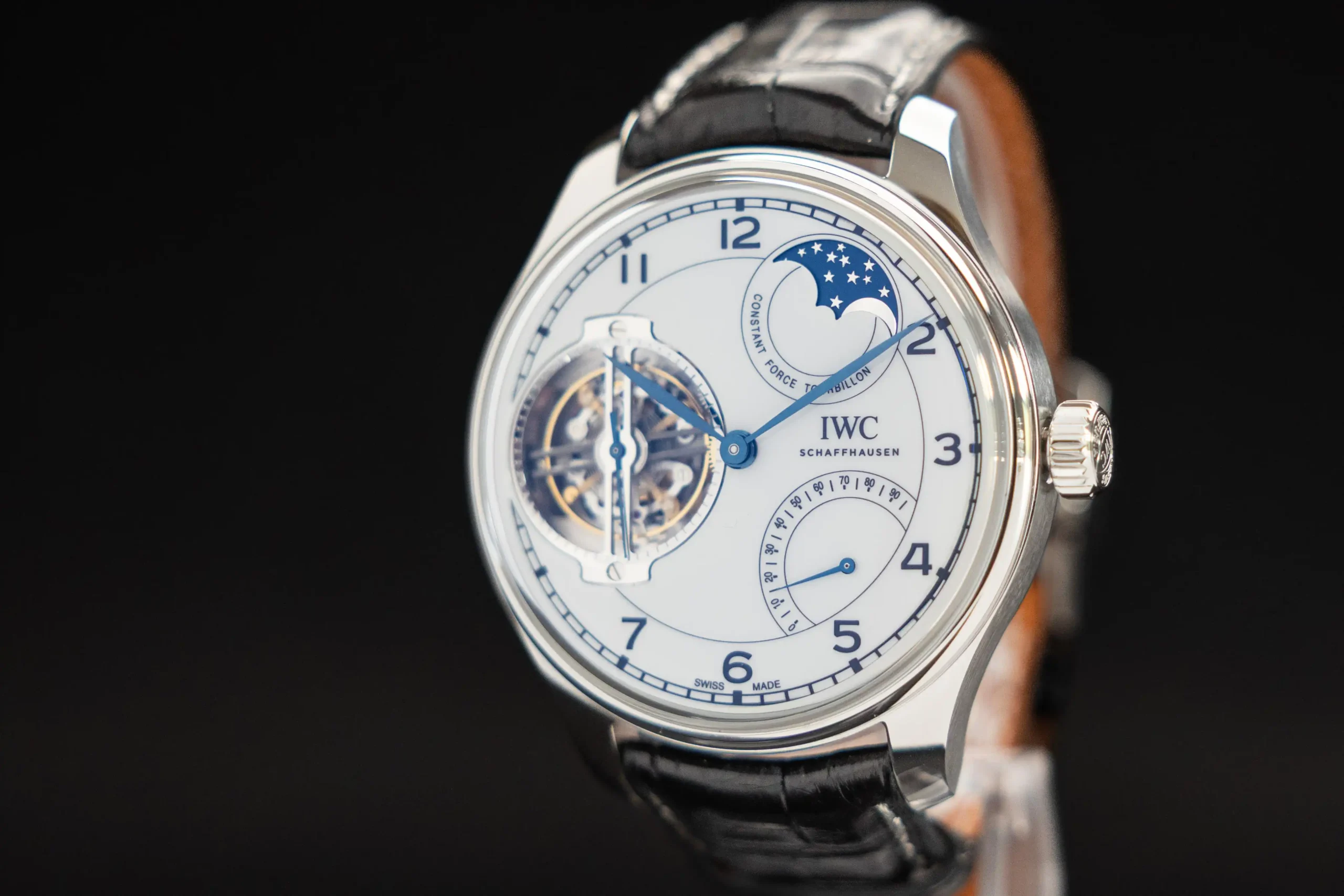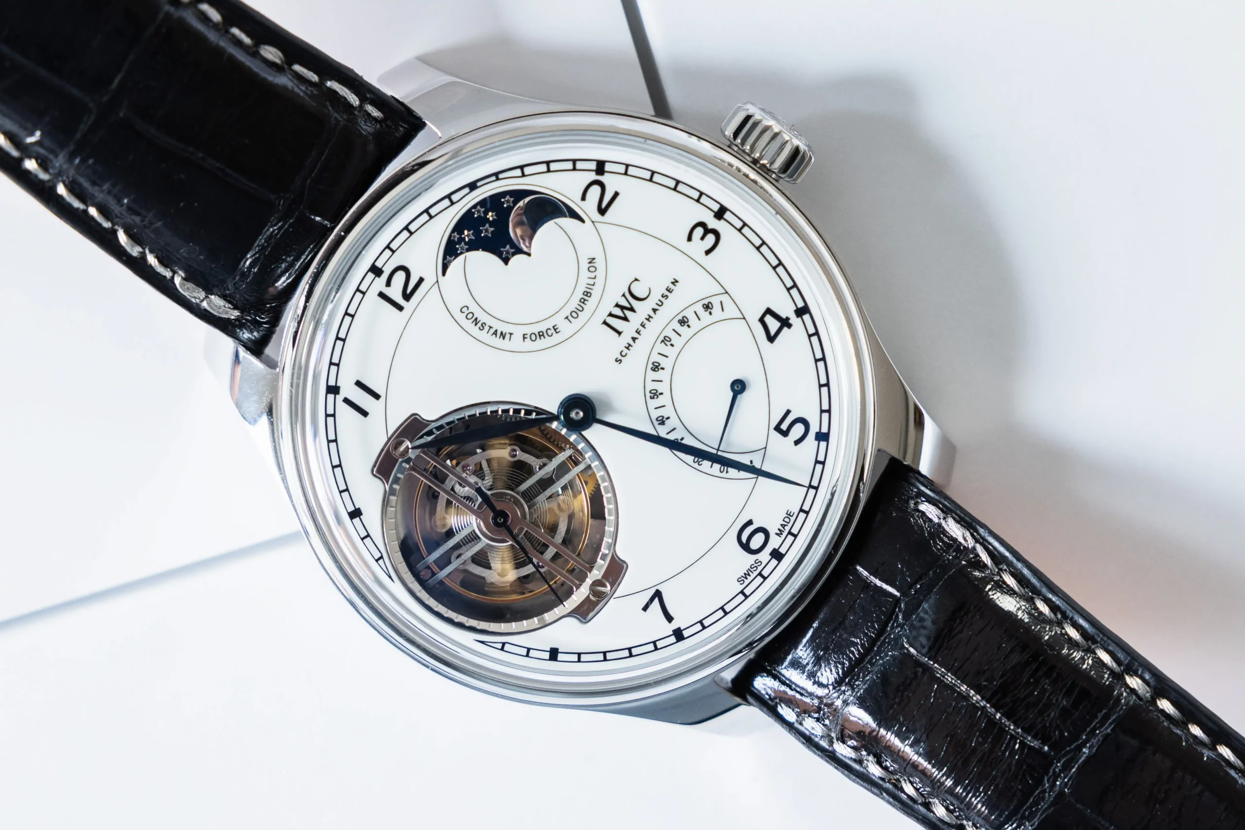 Das Highlight dieser Portugieser ist zweifellos das Constant-Force-Tourbillon bei 9 Uhr. Diese hochkomplexe Komplikation sorgt dafür, dass die Federkraft gleichmässig abgegeben wird und die Uhr eine konstant hohe Präzision behält, unabhängig vom Spannungszustand der Feder. Damit vereint IWC traditionsreiche Uhrmacherkunst mit innovativer Technologie auf höchstem Niveau.