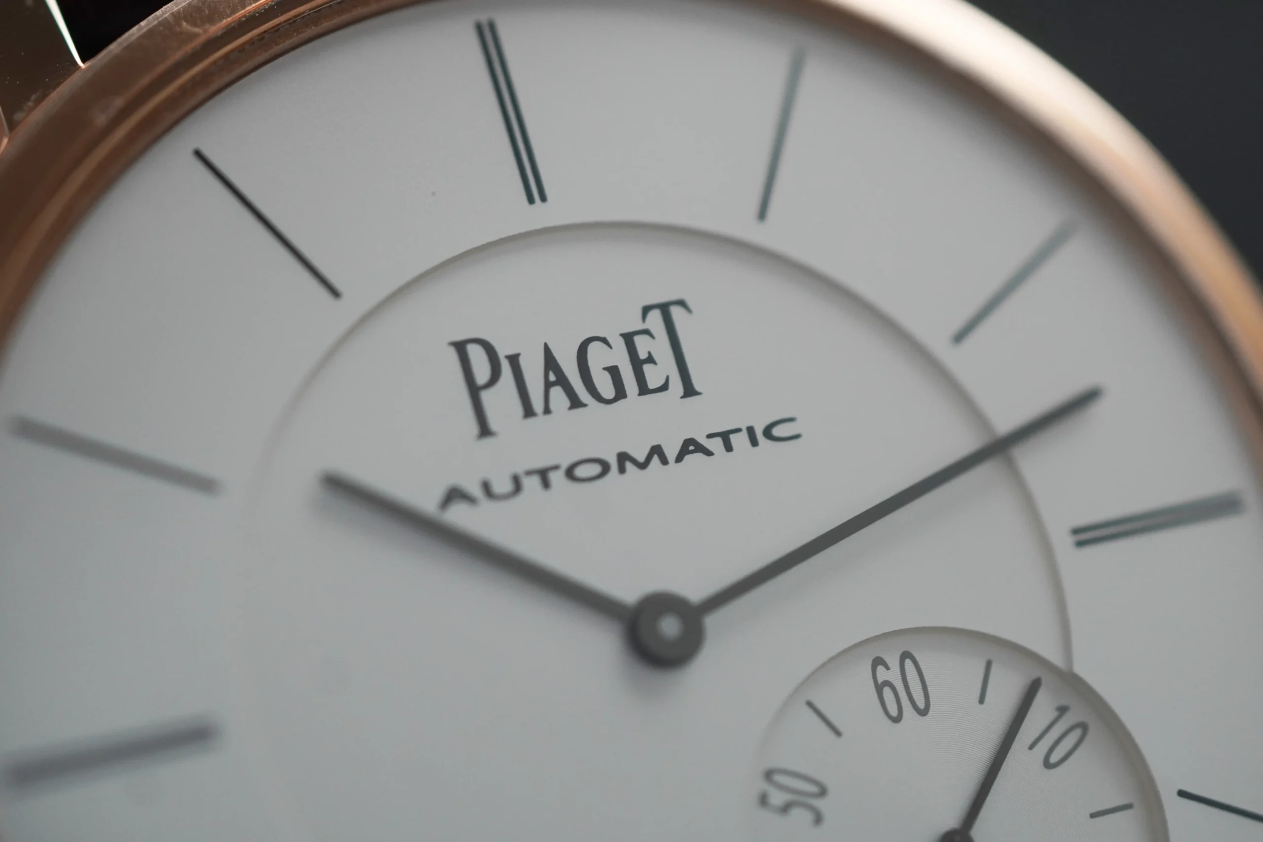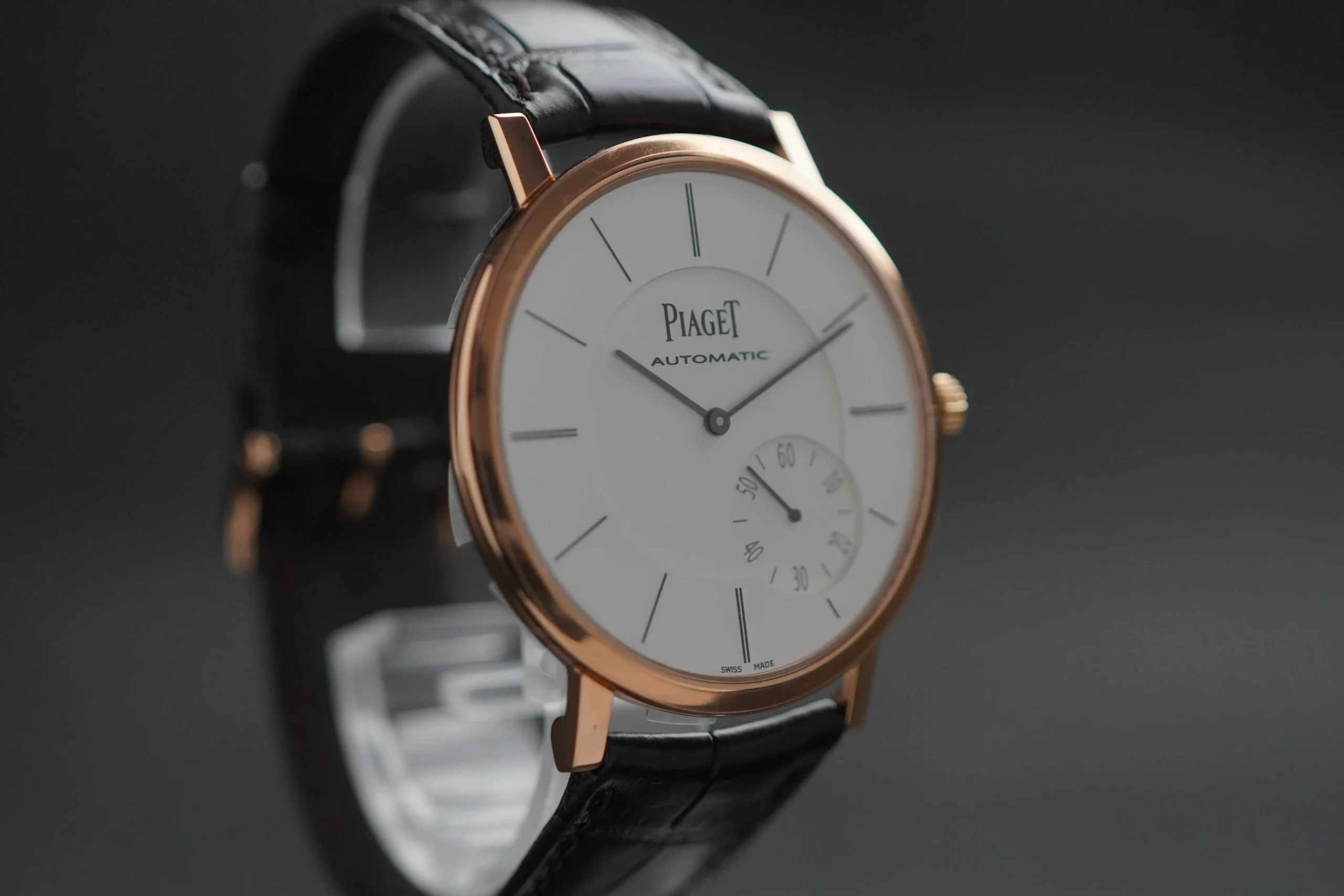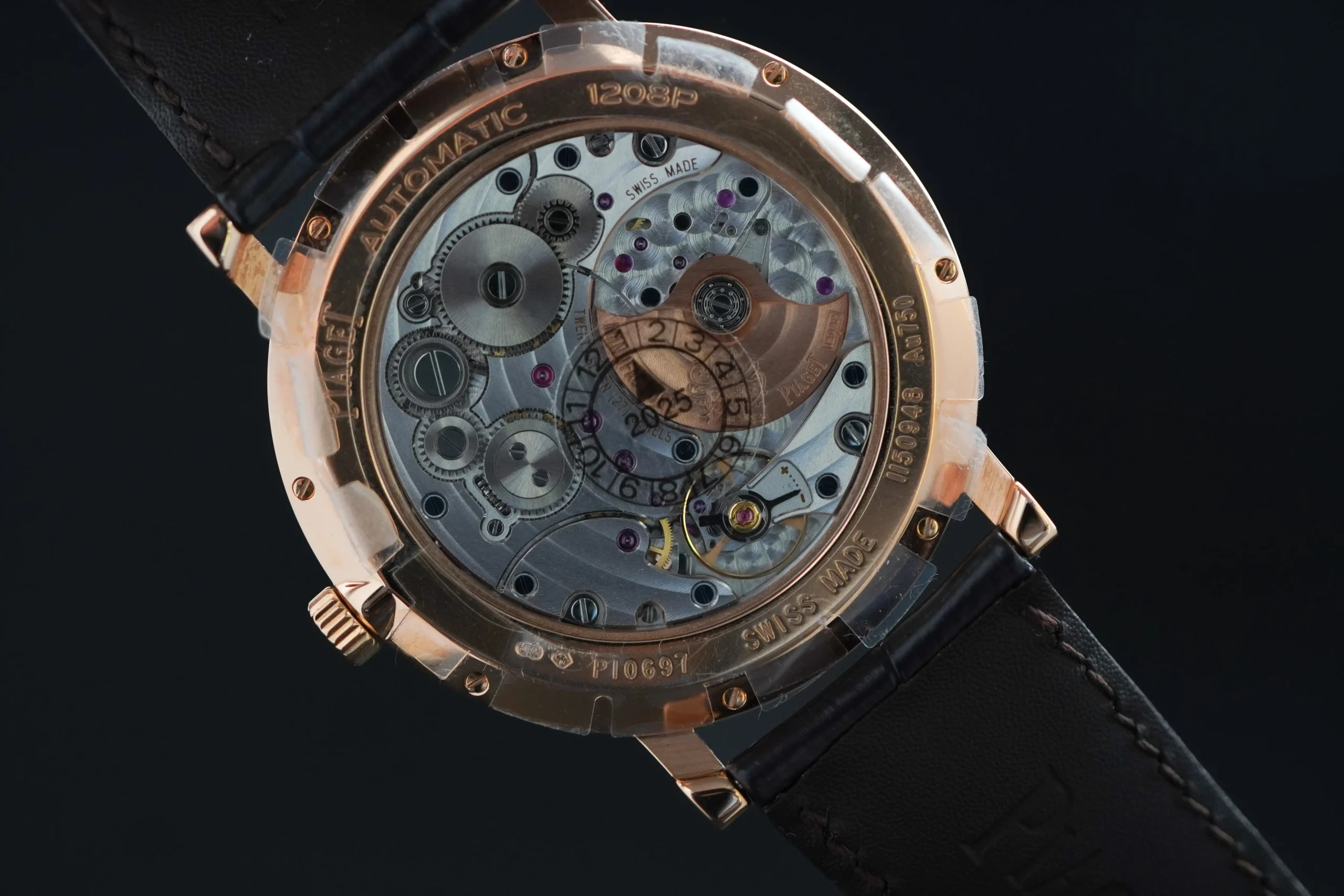 Das 43 mm grosse Gehäuse aus 18 Karat Roségold besticht durch seine feine Verarbeitung und seine aussergewöhnlich flache Silhouette. Trotz der geringen Bauhöhe beherbergt die Uhr ein automatisches Manufakturwerk mit integriertem Mikrorotor, sichtbar durch den Saphirglasboden. Diese platzsparende Lösung erlaubt ein mechanisches Uhrwerk mit Automatikaufzug, ohne Abstriche beim eleganten Design.